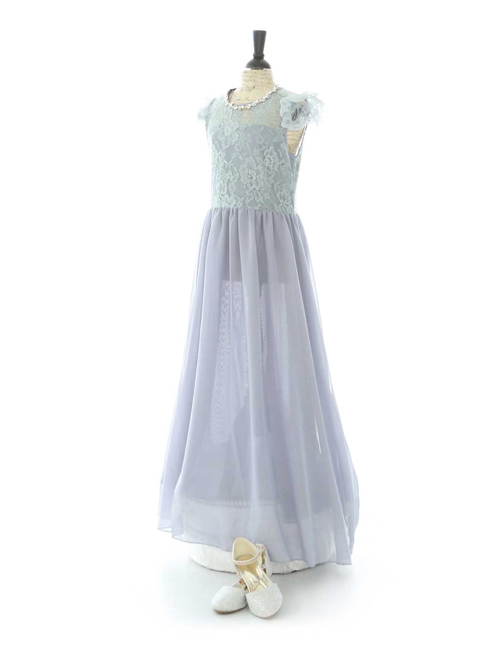 淡いブルーグレーのシフォン素材が使われたエレガントなロングドレスです。トップス部分には繊細なレースが施され、肩にはフリルが付いており、フェミニンで上品な印象を与えます。 スカートは軽やかで流れるようなシルエットが特徴で、動くたびに美しいラインを描きます。シンプルながらも華やかさがあり、アクセサリーやシューズとの相性も抜群です。
