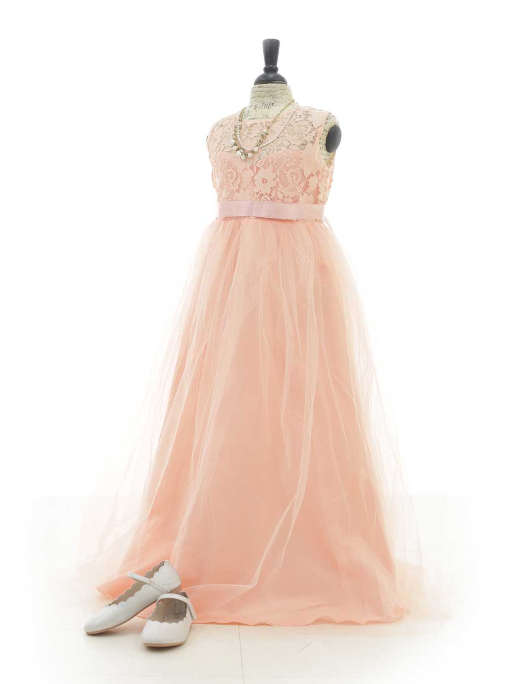 柔らかなピーチピンク色が魅力的なエレガントなデザインです。トップス部分は繊細なレースで飾られ、ウエストにあしらわれたサテンリボンがアクセントを添えています。 スカートはふんわりとしたチュール素材で仕立てられ、軽やかで優雅な印象を与えます。シンプルながらも華やかな雰囲気を持ち、アクセサリーやシューズと合わせて上品なスタイリングが完成します。
