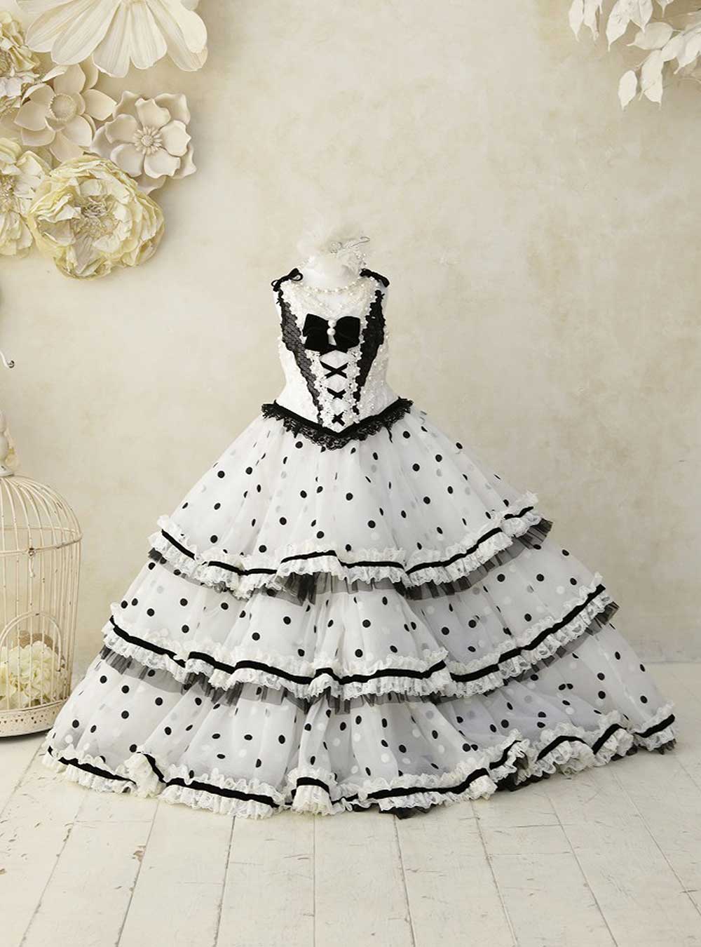 みんなに愛される王道のプリンセスラインドレス。フリルをふんだんに使用し、ボリュームたっぷりの可愛いシルエット。 モノトーンで統一し、トップス部分はレースやパール、編み上げリボンなど女の子らしさがぎゅっと詰まったデザインになっており、女の子の憧れるプリンセスになれるドレスです。