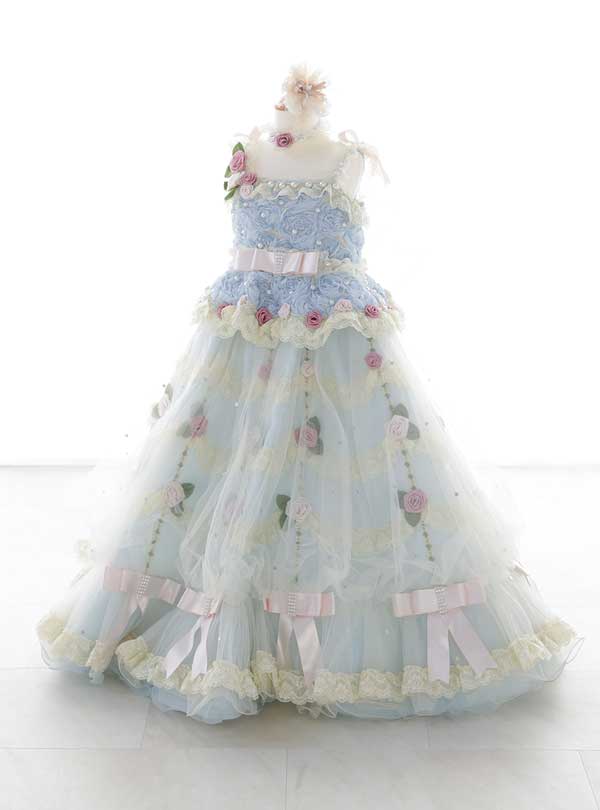 淡いブルーが特徴的な華やかなデザインで、上半身には繊細なレースと刺繍が施され豪華でありながらも優しい印象を与えてくれます。 ウエスト部分から足元にかけて立体的な薔薇とリボンがあしらわれ、ふんわりとしたチュール素材が可愛らしい定番ドレス。ウエスト部分にはサテンのリボンがアクセントとなっており、お姫様気分を味わいたいお子様にはぴったりの一着です。