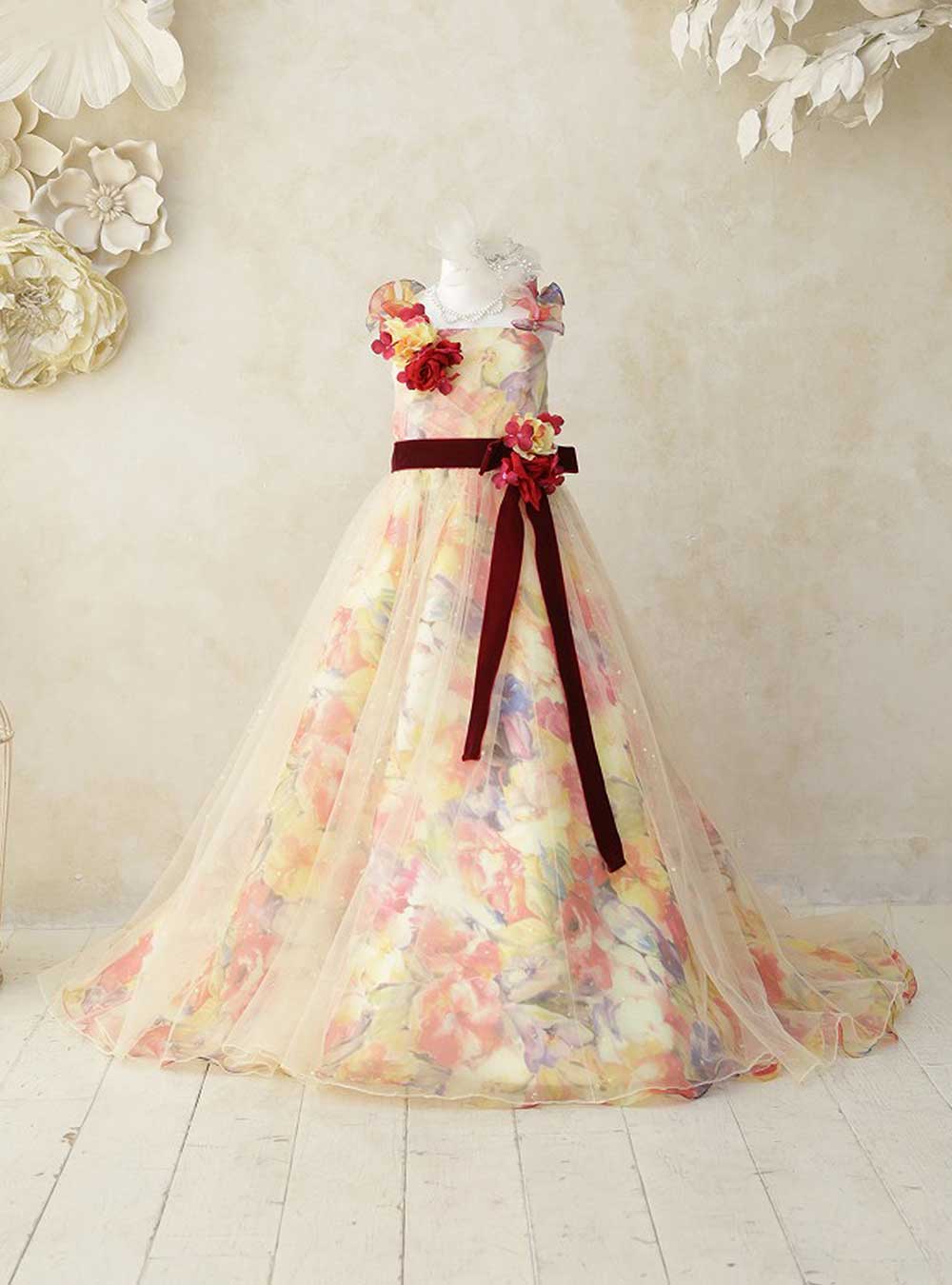 華やかなフローラルプリントが施されたドレスは、明るくフレッシュな印象を与えます。ウエストにあしらわれたリボンがシルエットを引き締めます。軽やかなチュールスカートは、動くたびに柔らかに揺れ、明るいイメージがお好きな方にぴったりの一着です。