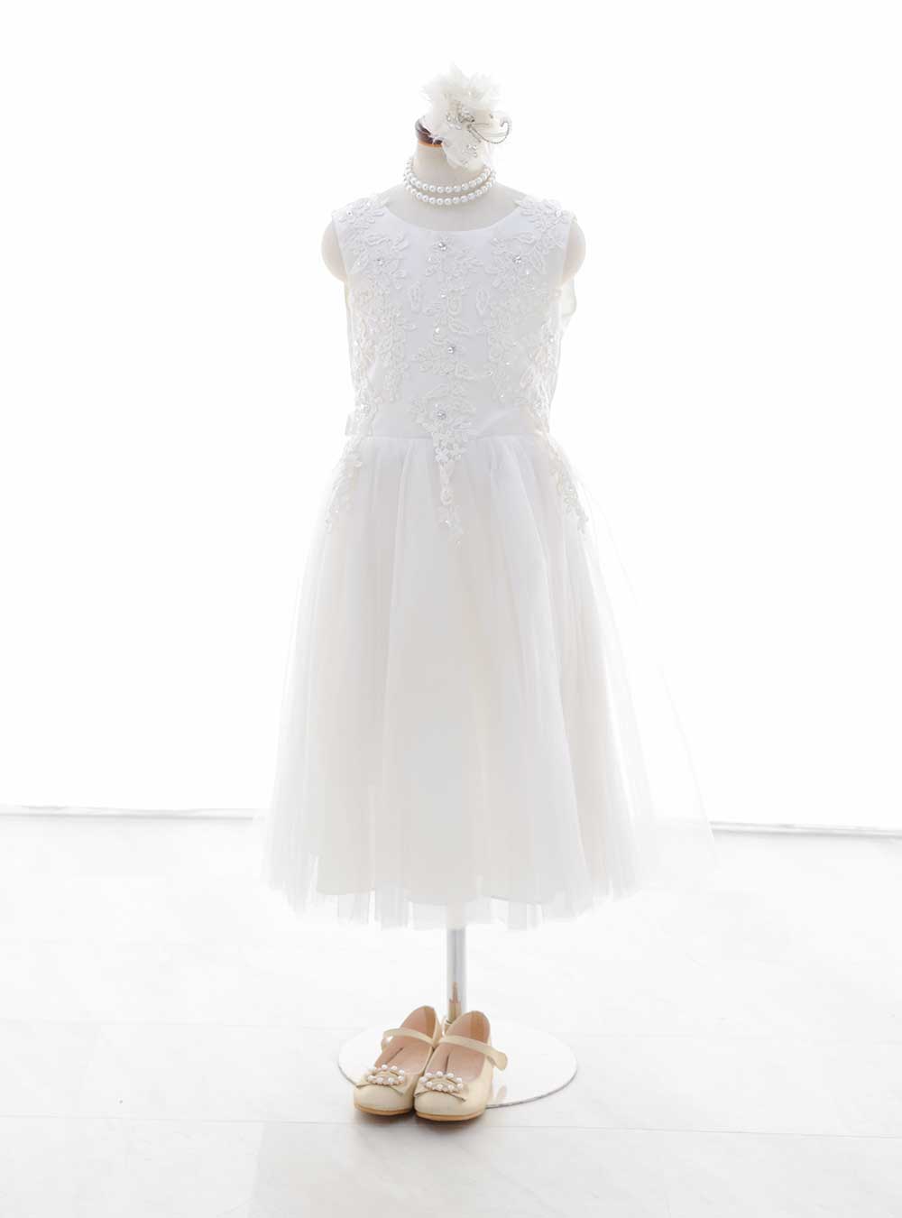 シンプルかつエレガントなホワイトカラーのドレス。上品なレースが施されたトップス部分はクラシックな美しさを演出し、スカート部分はふんわりと広がるミディアム丈のスカートで軽やかなデザイン。 裸足でナチュラルに撮影しても可愛いドレスです。