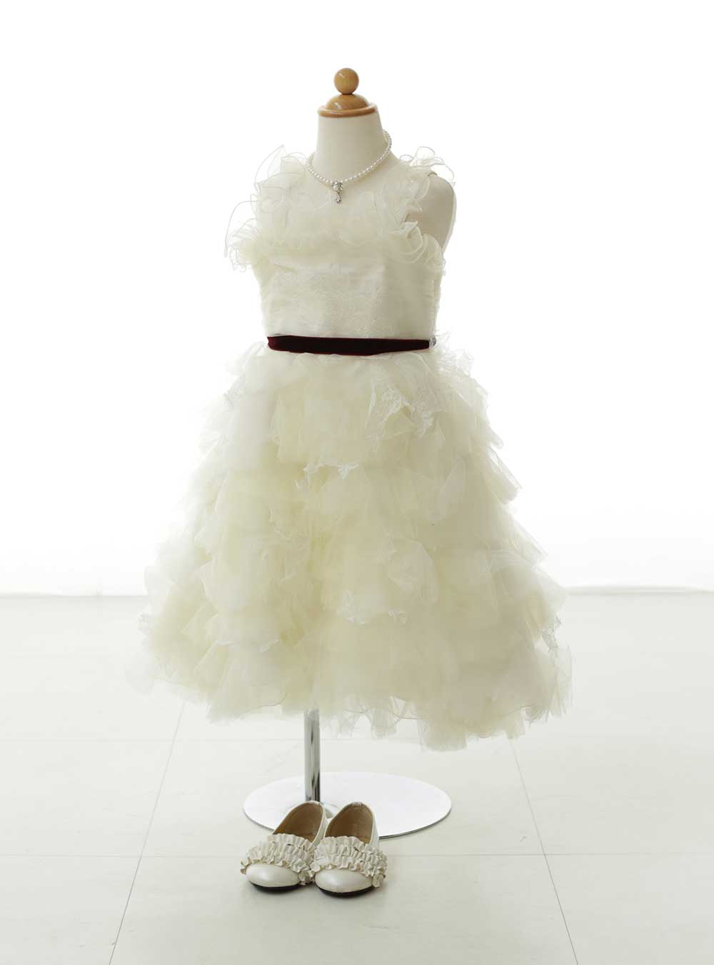 やや黄色がかったホワイトドレス。ショート丈のドレスで何段ものチュールフリルがナチュラルなAラインを作っています。胸元にもチュールフリルが施されボリューム感があり、シンプルながら細部のデザインが可愛いのがポイント♪ えんじ色の細いリボンでウエストマークしてあり、足長効果があります♪ホワイトドレスは数着ありますが、1番カジュアルなナチュラルドレスです。