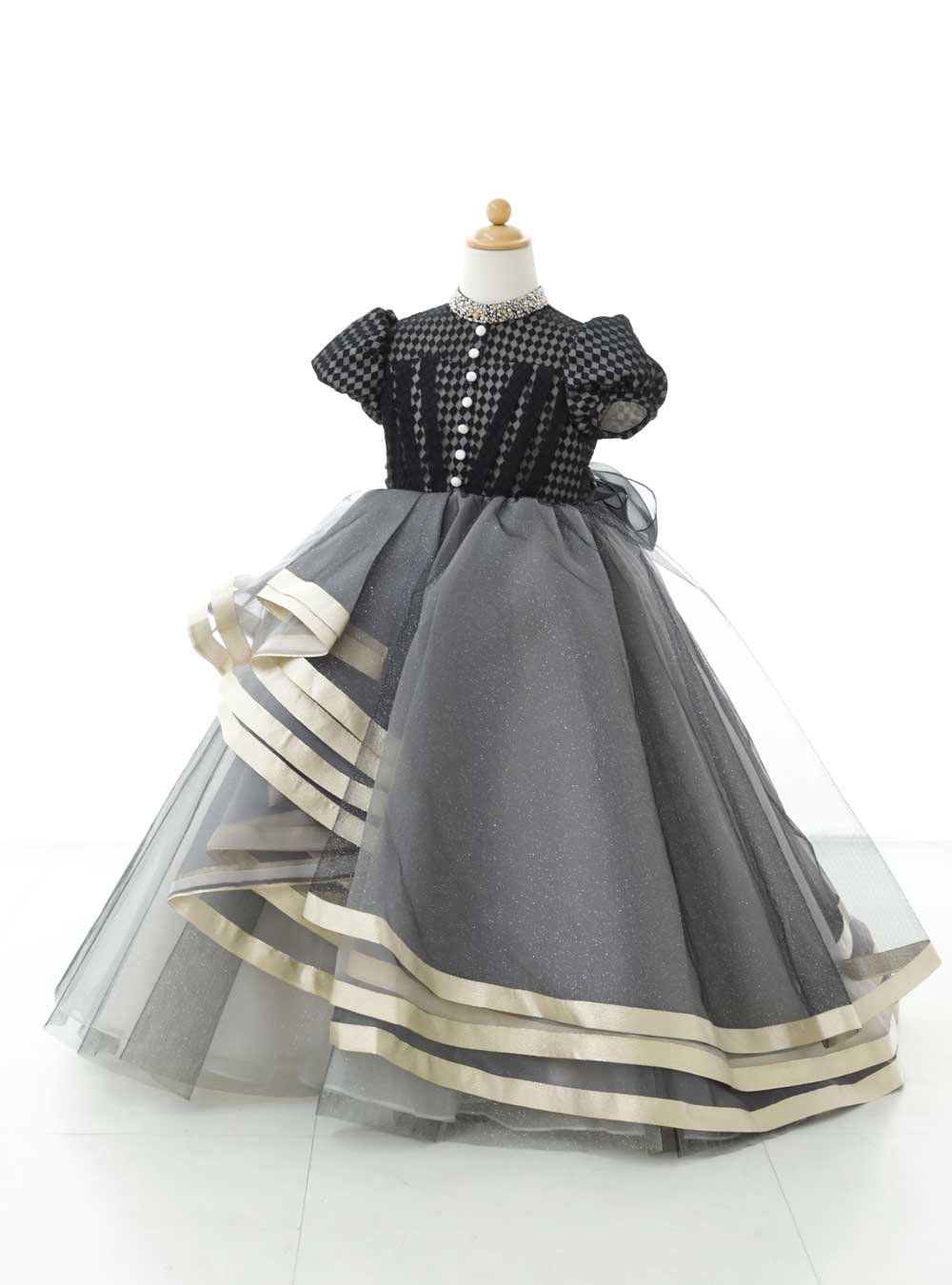 ドレスのデザインには珍しいハイネックのデザインで、首元にはゴールドのビジューやパールが装飾されています。センターには白のボタンが並んでおり、ギンガムチェック地のアクセントに♪ フワッと丸みのある肩のラインや広がるスカートが上品さとプリンセス感を強調しています。スカートにもゴールドのラインが入っていて、大人っぽく撮影したい方にオススメのドレス!