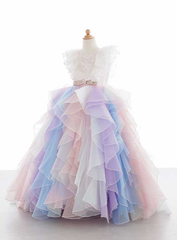 繊細なレースとビーズ刺繍がきらりと映えるドレス。肩まわりは透け感のあるチュールフリルがふわっと立ち上がり、顔まわりをやさしく華やかに見せてくれます。ウエストには淡いベージュのベルトを合わせ、中心の小さなリボンが上品なアクセントに。スカートはラベンダー、スカイブルー、ベビーピンクなどのパステルが重なり合う多段フリルで、歩くたびに色が溶け合うように揺れる軽やかなボリューム感が魅力です。