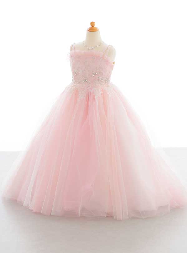 シンプルで可愛らしいデザインが特徴のドレス。全体に淡いピンクのチュールが使用され、スカート部分は何枚もチュールが重なっているため、ふんわりとしたボリューム感がある人気のプリンセスラインに! 肩のストラップは細めになっているので胸元のビーズやレースのデザインが目立ち、繊細で華やかな印象になります。お子様にすごく人気なドレスです♪