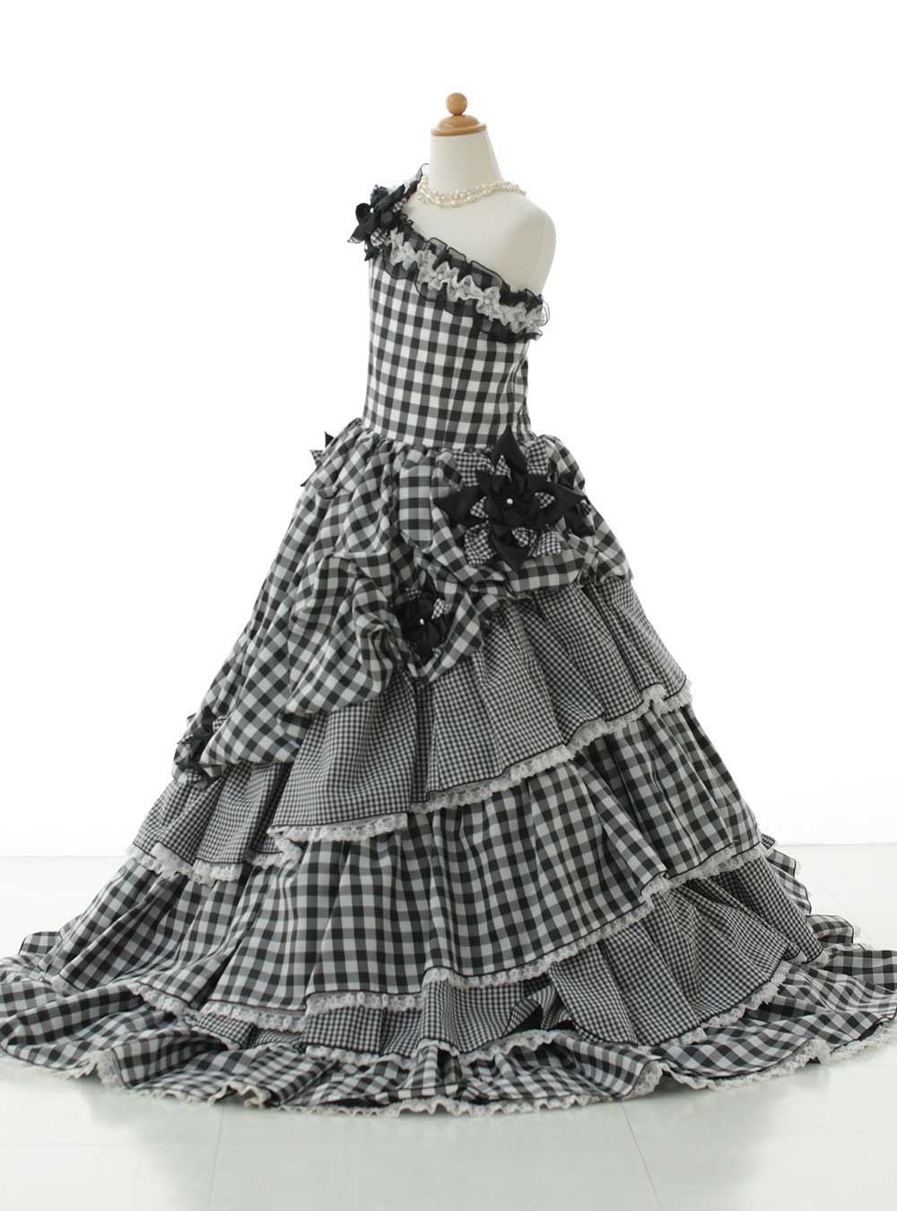 モノトーンのギンガムチェック柄のAラインドレス。スカートは細かさの違うチャック柄が斜めカットのフリルとして何層にも重なり自然なボリューム感があります。アシンメトリーのワンショルダーが特徴的で他のドレスとは一味違ったデザイン! 肩がザックリ開いているので大ぶりのアクセサリーが似合います♪肩やウエストにも同じデザインの花の装飾が付いているのがワンポイント!