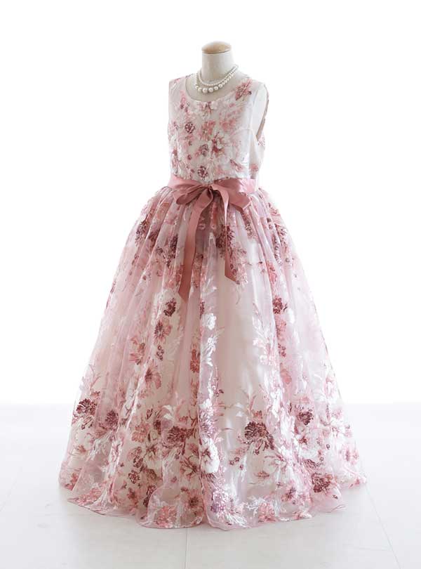 淡いピンクに花柄の刺繍が特徴のドレス。 柔らかいピンクベースに全体に施された花柄が上品な印象を与えてくれる1着。大きなリボンやお花をモチーフにした刺繍など、女の子が大好きな要素が盛り込まれており、プリンセスのような雰囲気を演出できます。 上品で大人っぽいデザインですが、柔らかな素材や優しいピンクが女の子らしさを引き立てます。7歳用にも同じデザインのドレスをご用意しているので、是非姉妹でお揃いの衣装を着て撮影しませんか♪