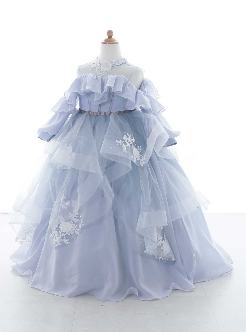 オフショルダーデザインが特徴的な青色のドレス。ふんわりとしたチュールスカートが美しく、子供らしい可愛らしさと同時に上品な雰囲気も漂わせてくれます。 首元や裾には繊細なレースがあしらわれ、華やかさをプラスしてくれます。オフショルダーとハイネックデザインが、珍しいオシャレな1着です。