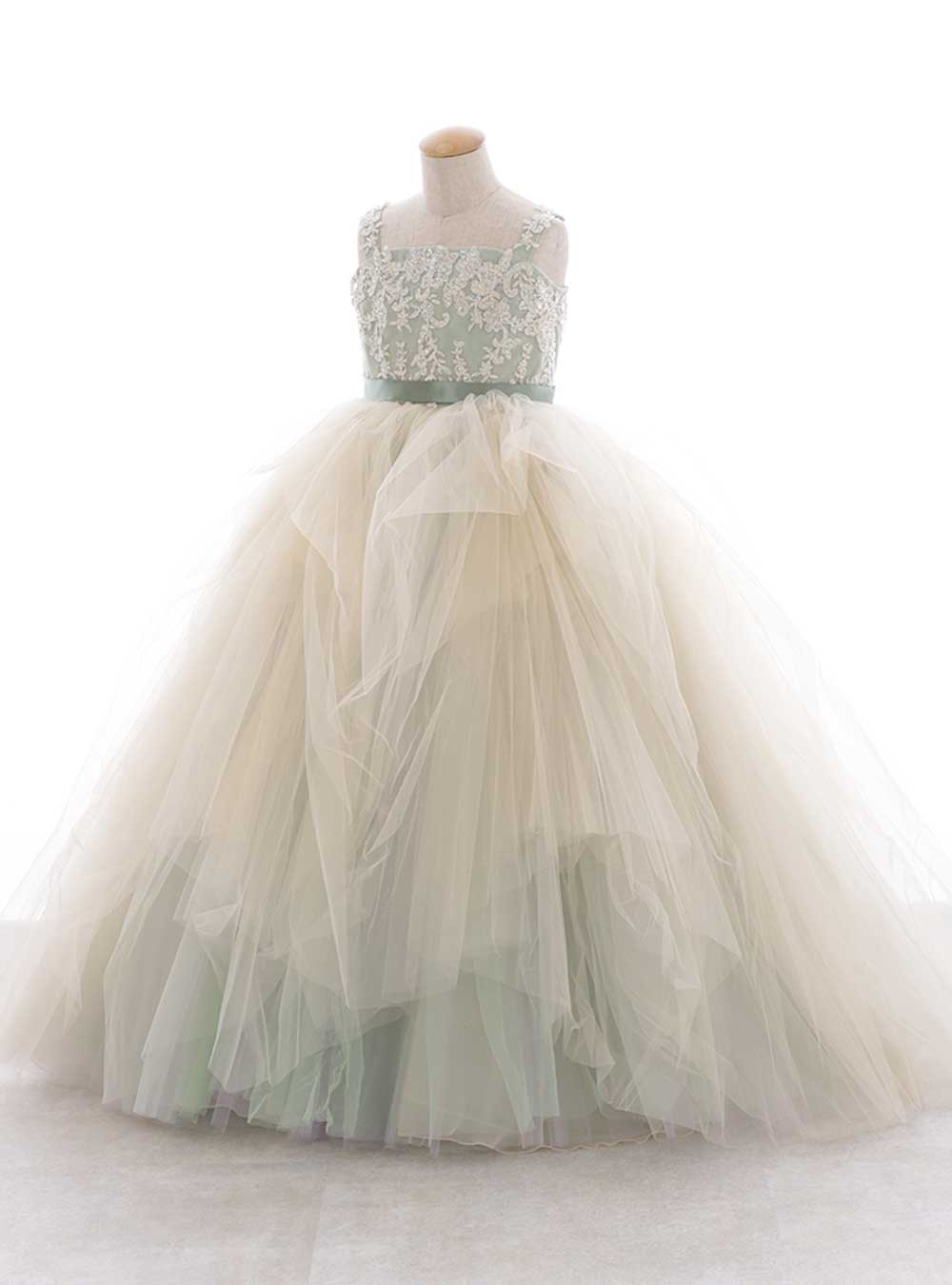 裾にかけて華やかで繊細なチュール素材が可愛らしい、柔らかくフェミニンな印象を与えるミントグリーンのドレスです。 胸元には刺繡が施されており、ウエストのリボンがアクセントとなり、ウエストラインをキュッと引き締め、そこから裾に向かって広がるシルエットは女の子らしさを演出してくれます。