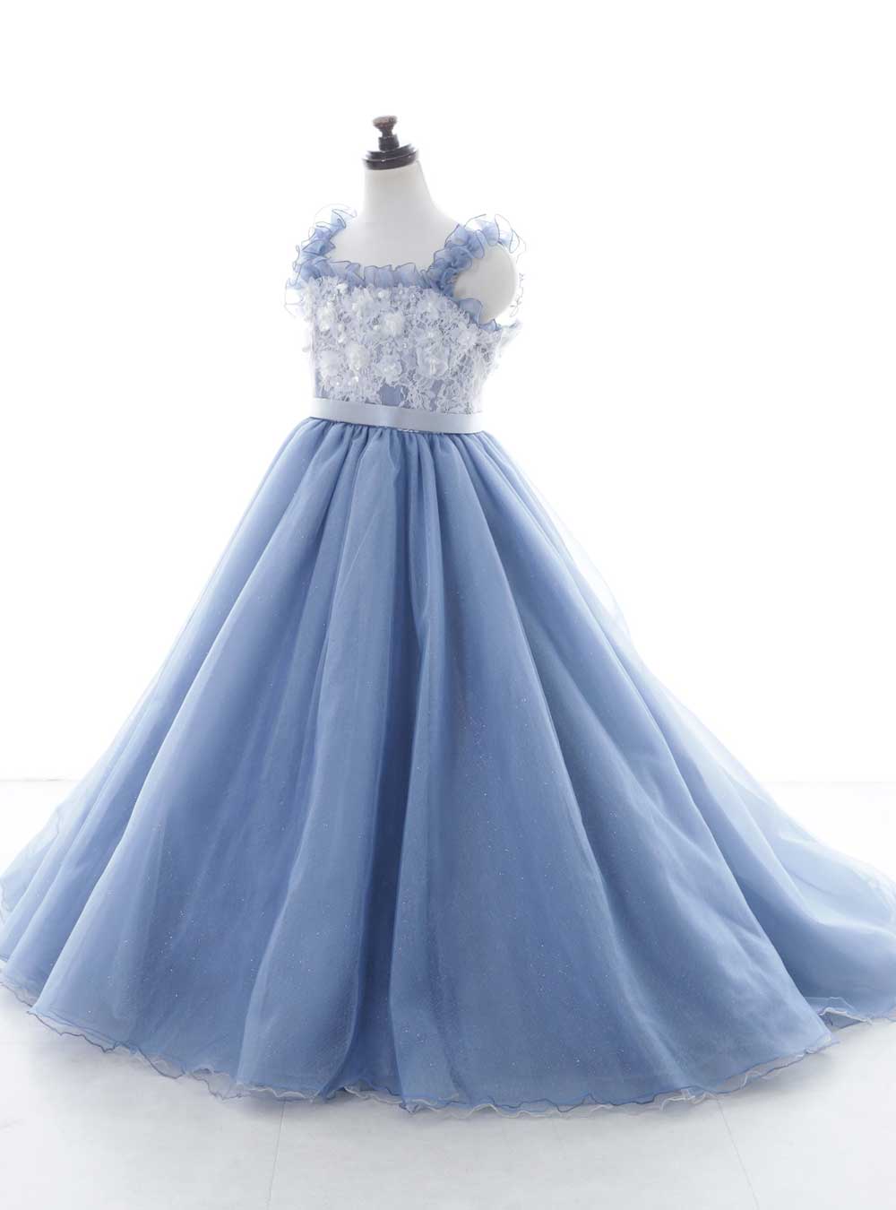 晴れの日の主役を輝かせる、スカイブルーのフラワーガールドレス。シンプルながらも華やかで、どなたでも似合うデザインになっています。肩元のフリルと胸元の繊細な花柄のレースとパールが上品な雰囲気を醸し出します。 ふんわりとしたチュールスカートが、 まるでプリンセスのような優雅なシルエットを作り上げ、まるで雲の上を歩いているような軽やかさを演出します。
