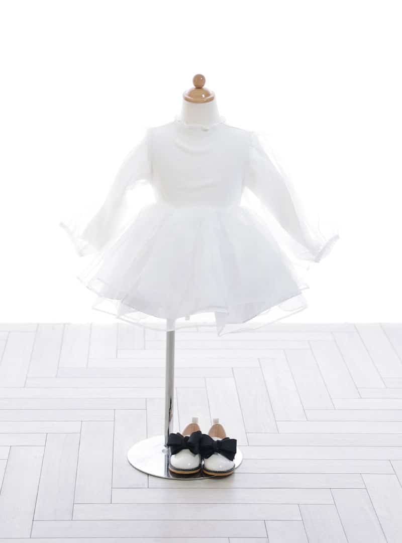 ふんわりと広がるスカートが特徴で、まるでプリンセスのような可愛らしさを演出します。 トップスの袖部分はスカートと同じ素材のチュールで施されていて統一感のある上品なデザインになっています。 ネックレスや髪飾りを付けて、撮影小物のバックを持ったりしても可愛い一着です。