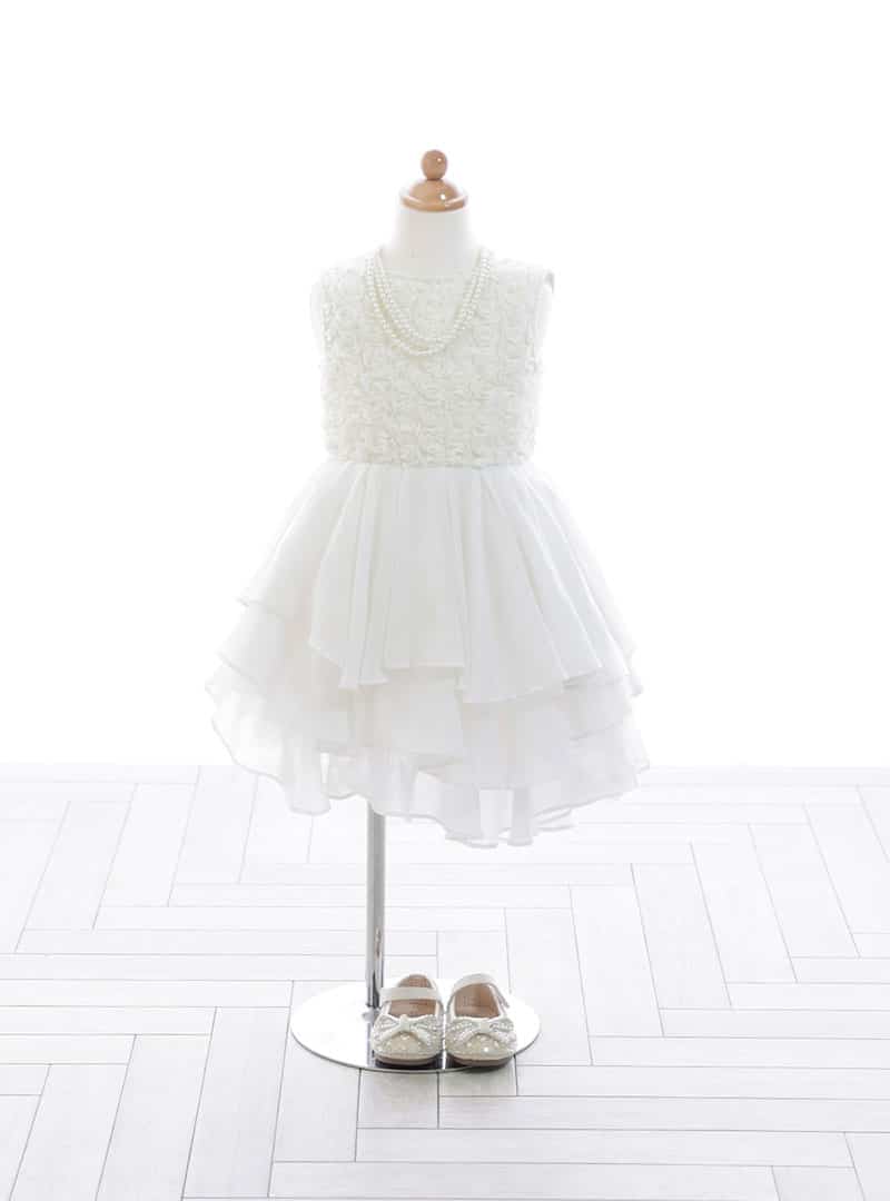 天使のような真っ白なデザインが印象的な1着。ウエストの切り返し部分でデザインが変わっているため、真っ白でも魅力を感じられる衣装です。胸元はローズチュールになっており、立体感のあるバラが華やかさを演出してくれます。 スカート部分はシフォン生地で何段にも重なっているためボリューム感もあり、より女の子らしさを惹き立て柔らかい雰囲気にしてくれます。