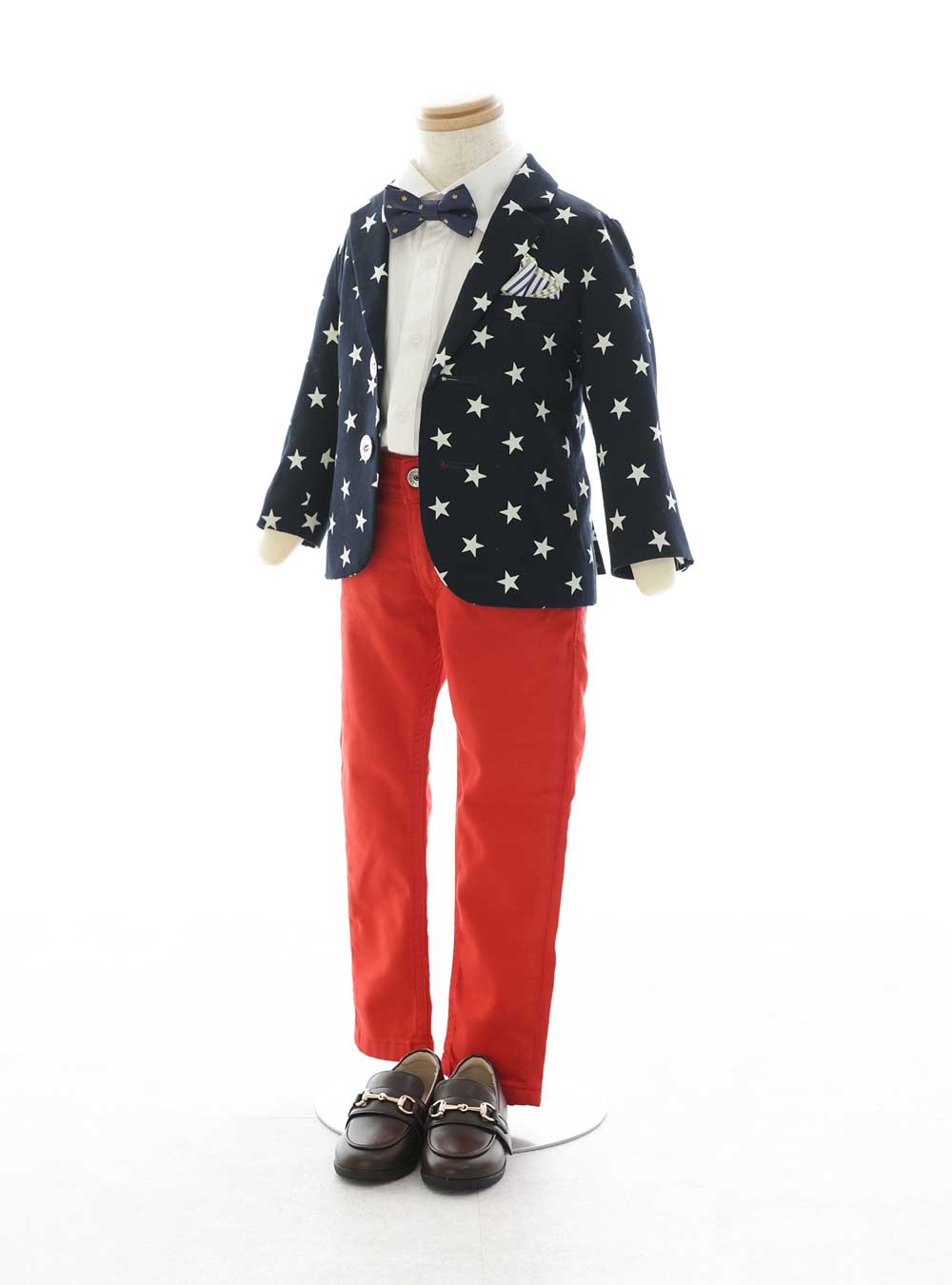 上半身を彩るネイビーのジャケットには、大小さまざまな白い星がちりばめられており、遠目にも近くからでも視線を惹きつけ華やかな印象を与えます。胸元にはストライプ柄のポケットチーフが差し込まれ、全体に統一感を与えます。 星柄が特徴的なネイビーのジャケットと赤いパンツを組み合わせた遊び心溢れるデザインがスタイリッシュで魅力的です。