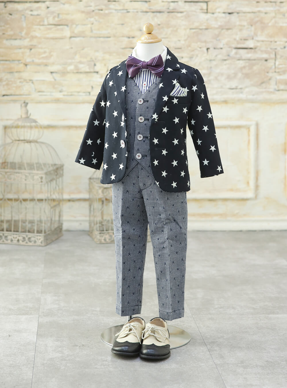 星柄が大胆にデザインされたネイビーのジャケットに、ストライプ柄のシャツ、グレーのギンガムチェック柄のベストとスラックスを合わせた、可愛らしいポップなコーディネートで、お子様の遊び心を表現できる装いです。 ベストとスラックスは落ち着いた色味で、全体的に統一感と与え、スタイリッシュな印象を与えます。