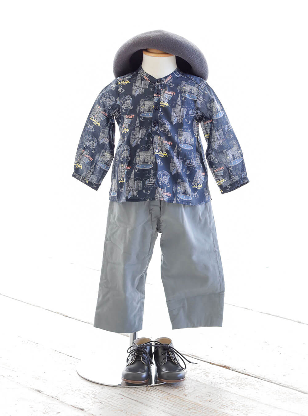 紺色柄シャツは、深みのある紺色に独特な柄があしらわれてありシックで落ち着いた印象を与えます。柄のデザインがコーディネートに個性をプラスし、お子様のファッションセンスをさりげなく引き立てます グレーのパンツはシャツの柄を引き立てつつ、全体をすっきりまとめ上げる役割を果たしています。紺色柄シャツとパンツがお子様の魅力を最大限に引き出します。