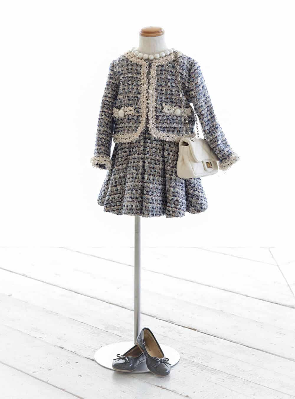 落ち着きと上品さがありスタイリッシュな印象を与えながらも、子供らしい愛らしさを感じさせてくれる黒と白のツイードのセットアップです。キュートなミニチュア感が特別感を演出し、お子様の可愛いらしさが引き立ちます。 まだ幼さが残るお子様のキュートさと、少し背伸びした大人っぽさが絶妙にミックスされた可愛らしいコーディネートです。