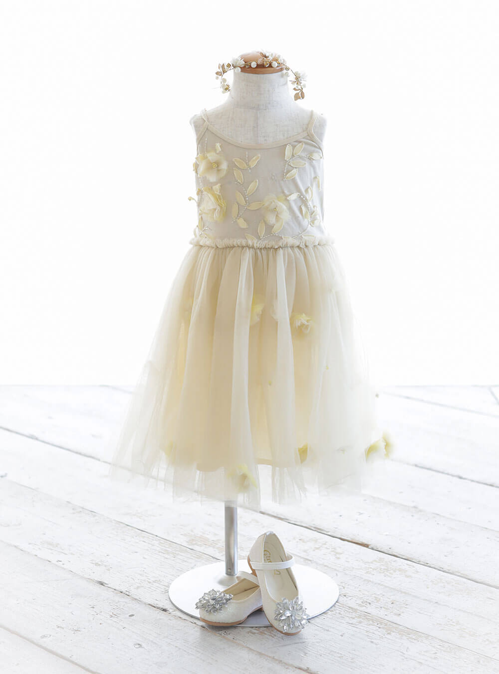 柔らかい色合いが愛らしい淡いイエローのワンピースです。胸元にほどこされたコサージュのさりげない可愛いらしさがポイントで、デザインがシンプルだからこそお子様の純粋な可愛らしさが引き立ちます。 ふんわりとしたシルエットのチュールのスカートは、動くと揺れるデザインが可愛らしく、子供らしい無邪気さや女の子らしさが引き立ちます。