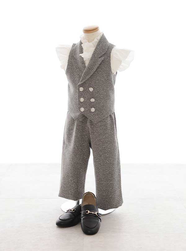クラシカルな雰囲気が魅力の洋装スタイル。上品なグレーのベストとパンツにフリルの効いたシャツを合わせることで、凛々しさの中にも可愛らしさをプラスしました。きちんと感がありながら動きやすく、自然な笑顔を引き出します。特別な一日をおしゃれに彩る一着です。