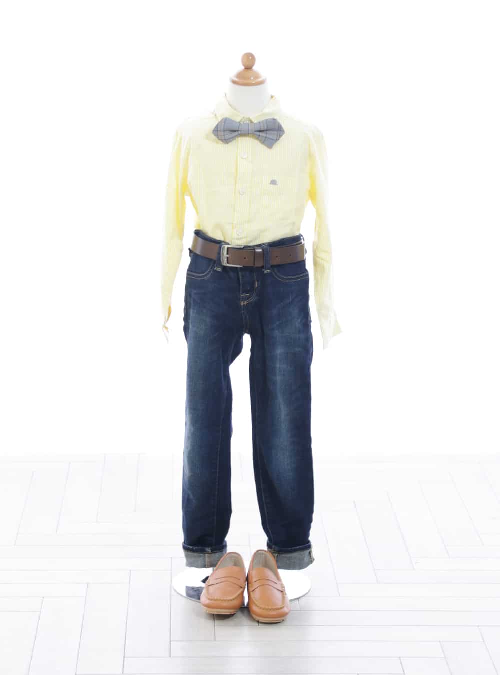 シャツは少し淡めのパステルカラー、パンツはデニムを合わせた春の風を感じる爽やかなコーディネートになっています。 デニムはロールアップすると足元に切り替えができてスタイルアップに!ベルトで引き締めて男の子らしさもプラス!