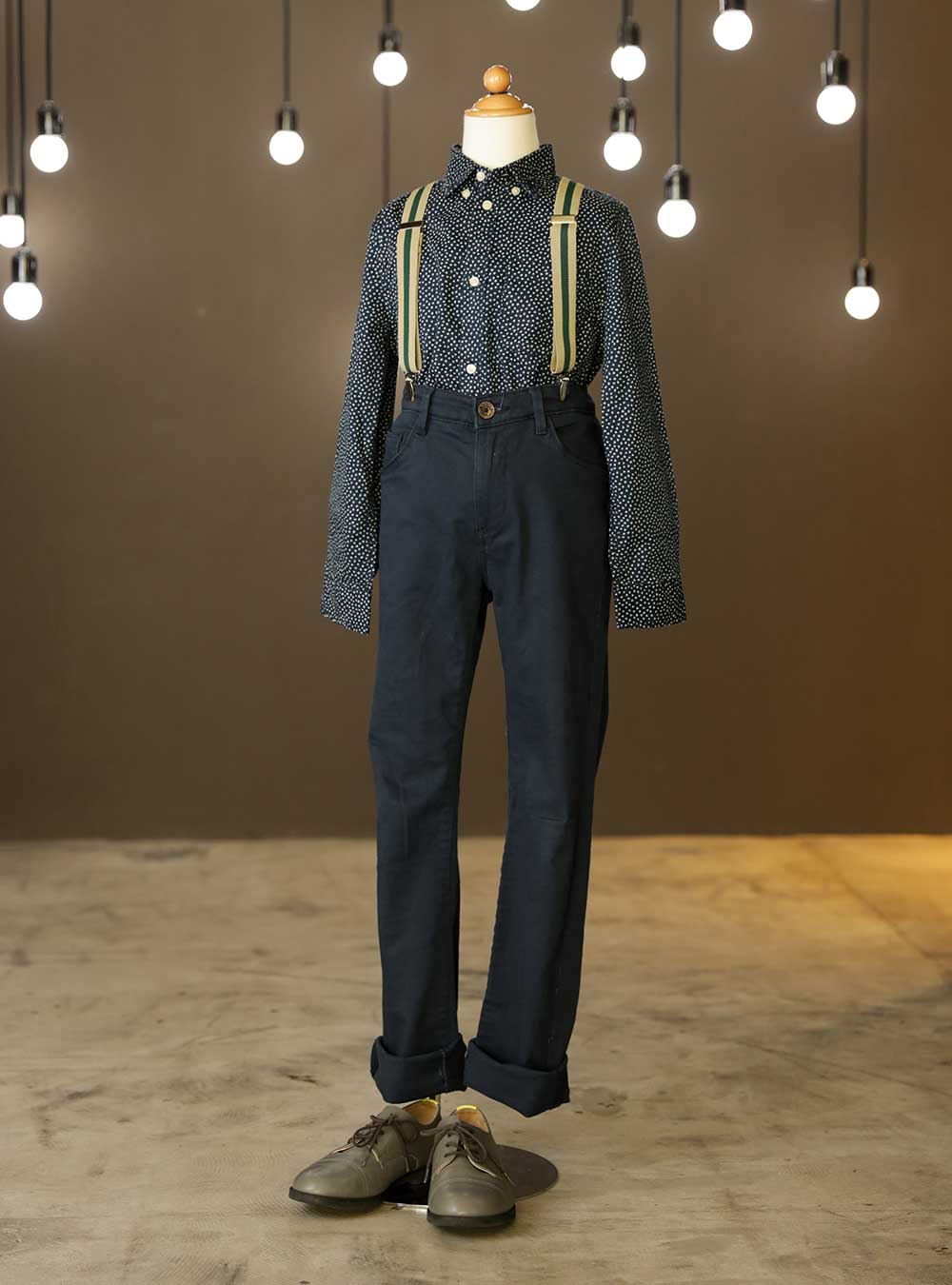 ユニークでありながらスタイリッシュな印象を与えるカジュアルな一着です。深いネイビーカラーのパンツはストレートカットでシンプルなデザインとなっています。 サスペンダーが全体のスタイルに遊び心を加えつつ、洗練されたシルエットを保ちます。シャツにはクラシックな柄が施されており、カジュアルでありながらもトレンド感を持っています。