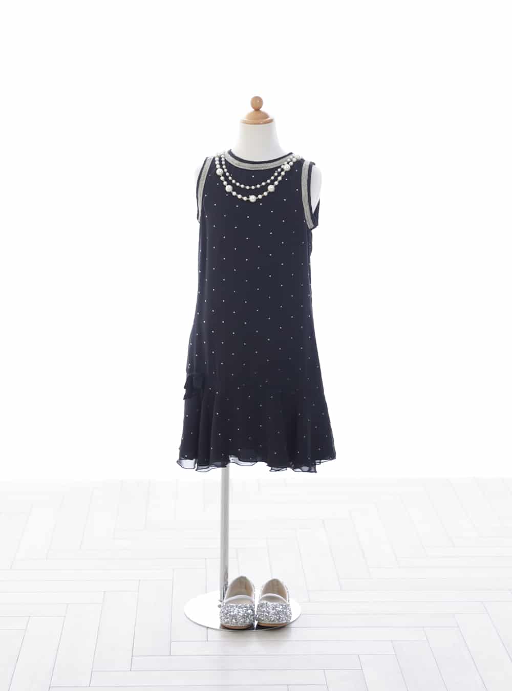 シンプルながらも華やかさを兼ね備えたスタイリッシュで洗練された一枚です。深い黒色のワンピースは柔らかな素材で仕立てられており、ストレートなラインが魅力的です。 全体にはさりげないドット柄が施されており、シックでありながらも遊び心を感じさせるデザインがポイントです。裾にかけてフレアが広がるデザインは歩くたびに優雅に揺れ、美しいシルエットを引き立てます。