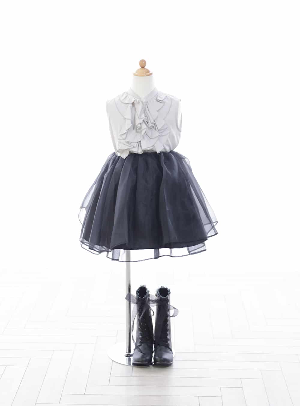 トップスはノースリーブのブラウスで、フロントには華やかなフリルとリボンがあしらわれ、エレガントな印象を演出。 ボトムスはふんわりと広がるブラックのチュールスカートで、透け感のあるレイヤードが軽やかさを加えています。フェミニンさとモード感が絶妙にミックスされたスタイルで、はやりの韓国風スタイリッシュな撮影ややわらかい外光撮影にも映えるコーディネートです。