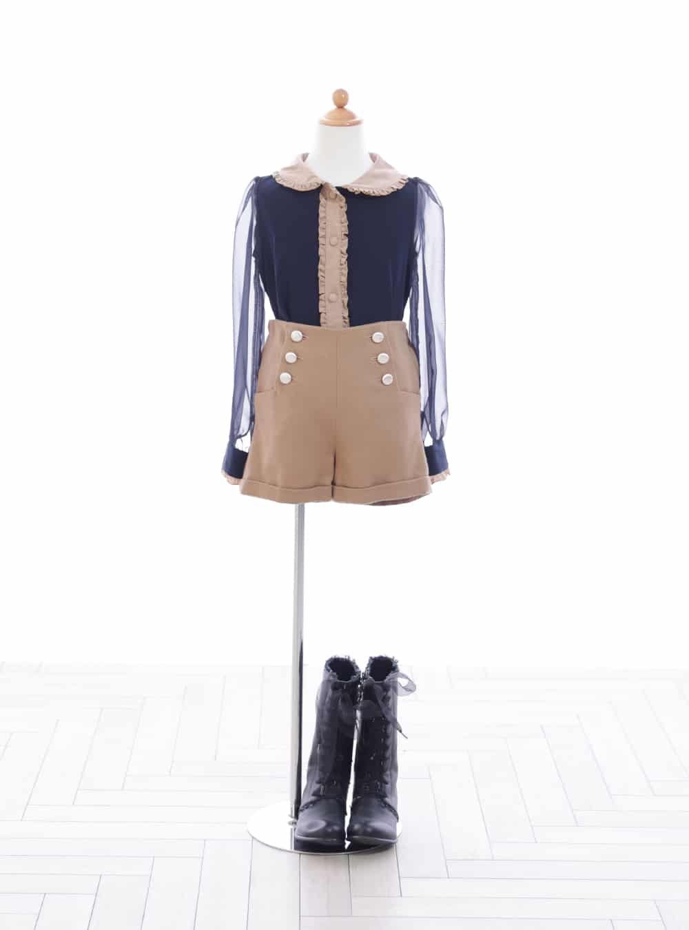 カジュアルさとエレガンスを兼ね備えたスタイリッシュな一着です。上品なネイビーブルーのブラウスは柔らかな素材感とボリュームのあるスリーブが特徴でクラシックな雰囲気を醸し出しています。フロントのリボンディテールが可愛らしさを添え、女の子らしさを引き立てています。 ショートパンツはシンプルでありながらも存在感のあるデザインでベージュの色合いがブラウスとの相性を良くし全体のバランスを整えています。