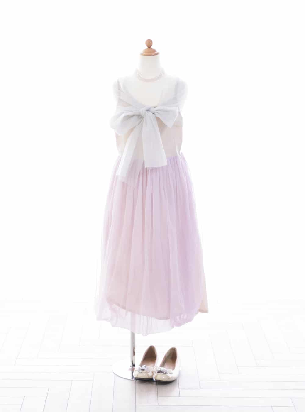カジュアルでありながら洗練された印象を与えるエレガントな一枚です。トップはホワイトカラーが清楚でシンプルなデザインが特徴です。スカート部分はチュール素材で作られており、やさしいライラック色が印象的です。 軽やかなテクスチャーがふんわりとしたボリューム感を生み出し、動くたびに美しい揺れを見せます。ウエスト部分にはリボンが施されており、シルエットにメリハリを加えます。