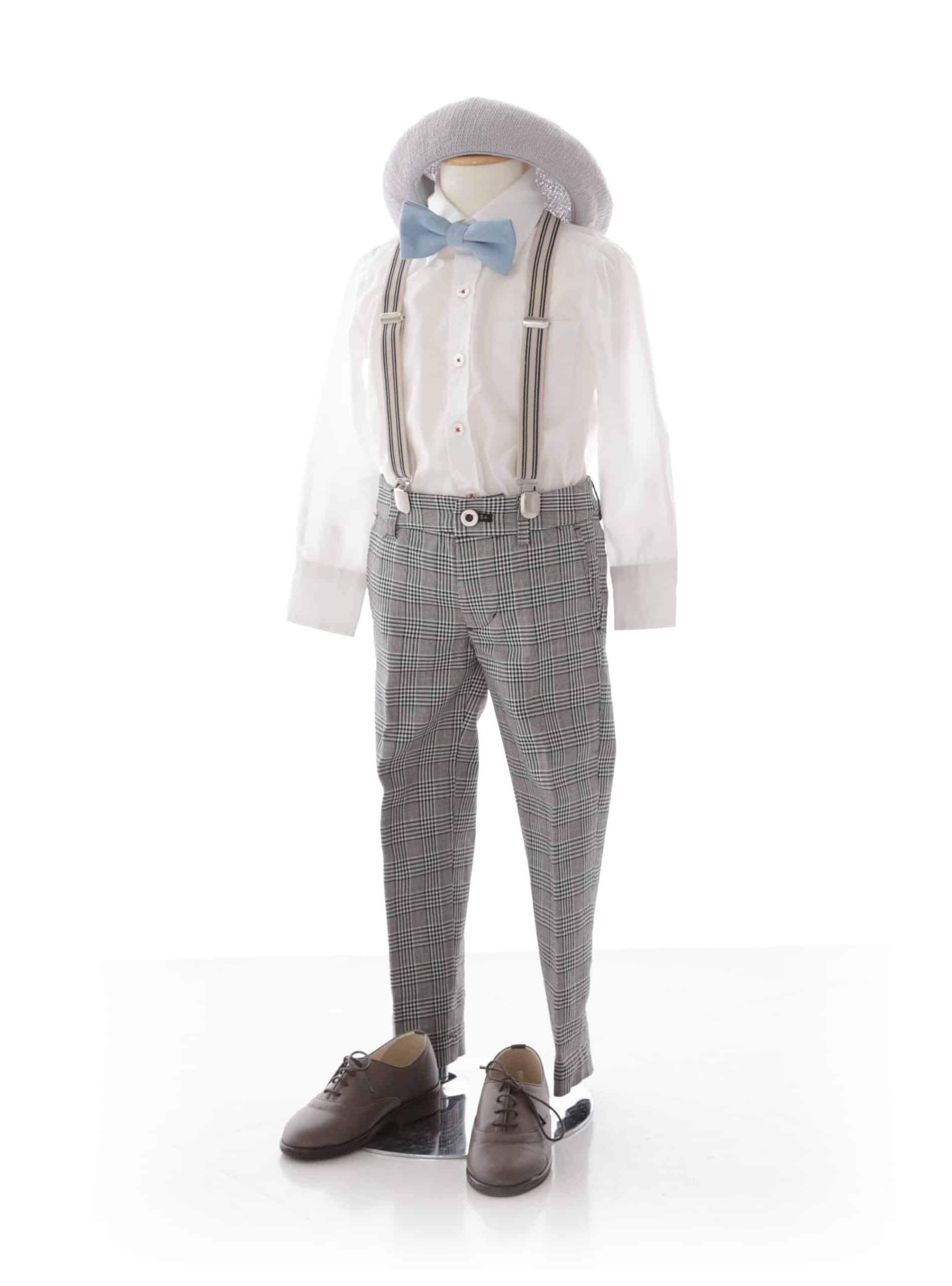 グレーのパンツにサスペンダーを組み合わせたクラシカルなスタイルで、清潔感と品の良さを感じさせるコーディネートです。ライトブルーの蝶ネクタイがアクセントとなり、シンプルな白シャツとの相性も抜群。柔らかい色合いのベレー帽が、全体の雰囲気に可愛らしさを加えています。フォーマルながらも遊び心のある装いで、落ち着いた中にも個性が光る1着です。