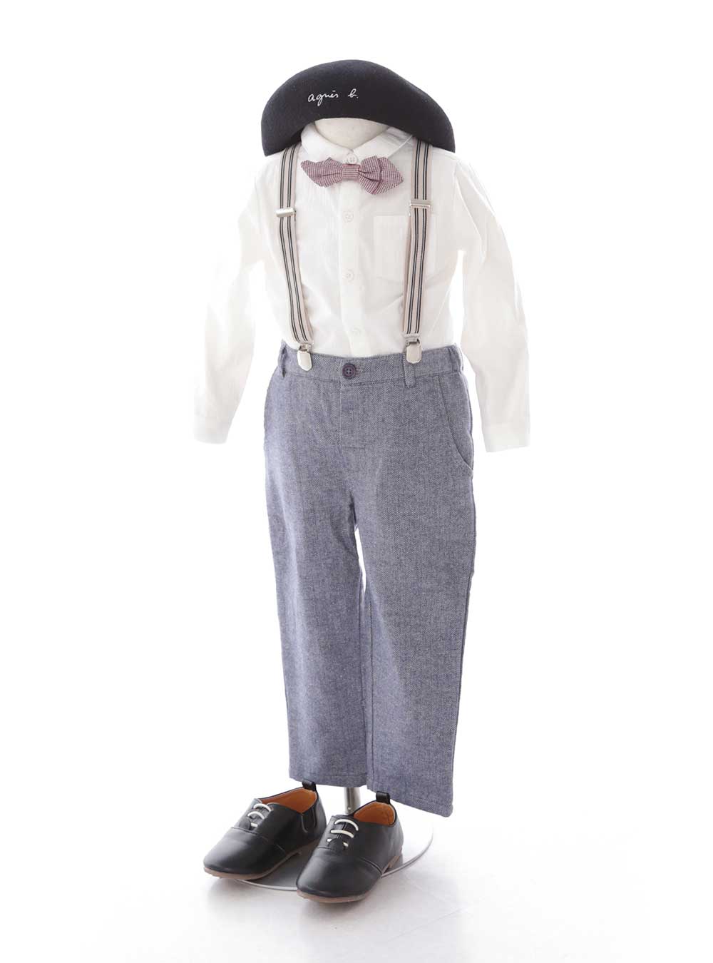 クラシックで愛らしいコーディネートが特徴です。白いシャツにグレーのパンツを合わせ、サスペンダーで引き締めたルックは、洗練されたカジュアル感を演出します。蝶ネクタイとベレー帽がアクセントとなり、子どもの個性を際立たせるオシャレな装いです。撮影シーンに華やかさと遊び心をプラスする1着です。
