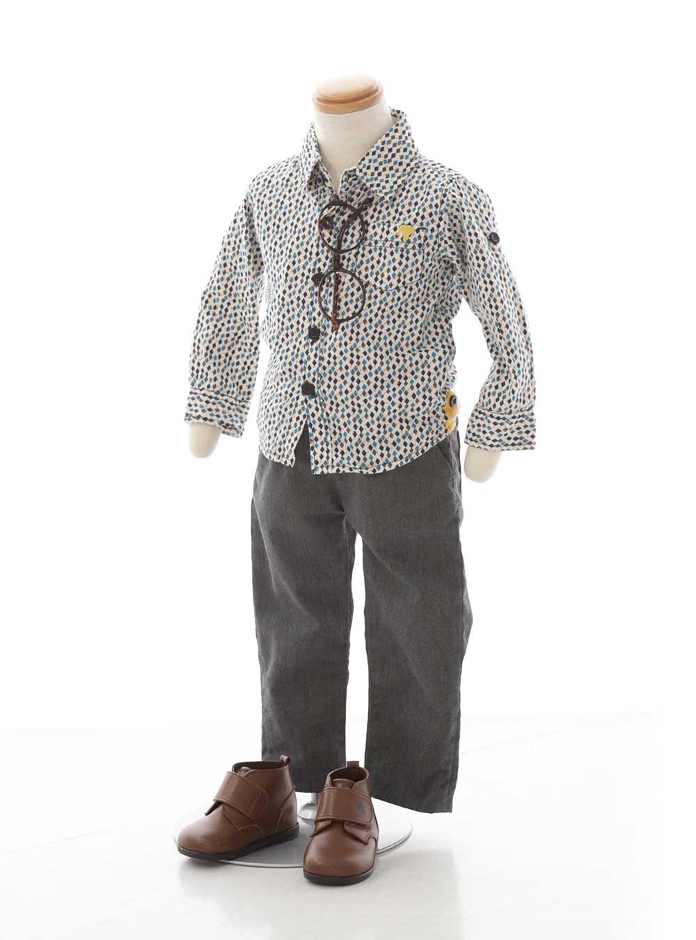 グレー×カジュアルシャツ 柄シャツがカラフルで楽しい雰囲気を醸し出し、撮影中のお子様の自然な笑顔を引き出します。ダークグレーのパンツは落ち着いた印象を与え、柄シャツとのバランスを取りながらも、全体のコーディネートを引き締めます。ブラウンのシューズは、クラシカルなタッチを添え、柔らかい印象を演出。様々なシーンで撮影しても映える、明るくて元気なスタイルです。