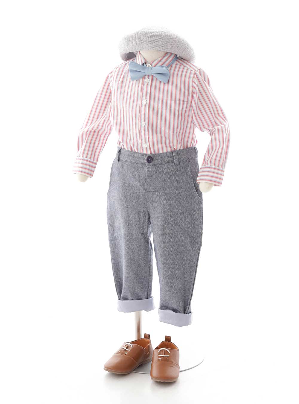 赤のストライプシャツにグレーのパンツが可愛い洋服タイプの衣装です。ストライプのシャツには蝶ネクタイの色と同じ水色が使われているので統一感があります。やわらかいパンツの生地でお着替えもしやすく小さなお子様もゆったりと着ていただけます。全体的に淡く可愛らしい印象なのでパステル調の背景やバルーンの背景での撮影が人気で、子供らしさが出るのでおすすめです。