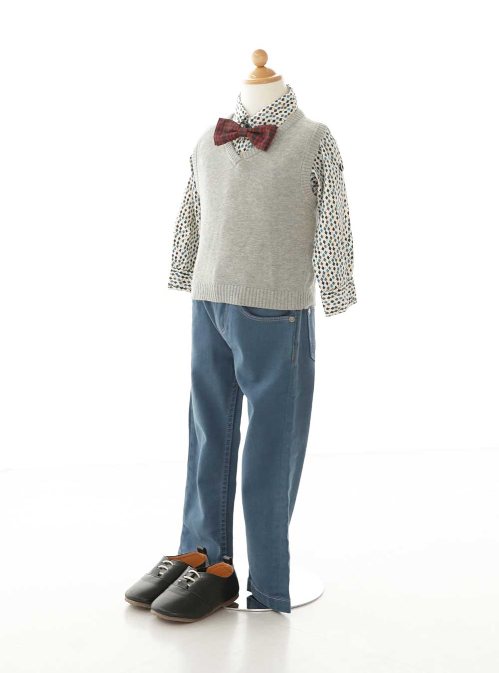 青色を基調としたダイヤ柄のシャツが目を引く、カジュアルスタイルの1着です。パンツには爽やかな色味のターコイズブルーを合わせ、男の子らしい印象を与えます。鮮やかな色味のパンツとシャツに淡いライトグレーのベストを合わせ、すっきりとしたコーディネートでまとめています。爽やかな色味の衣装ですのでパステル調の背景と相性抜群です。