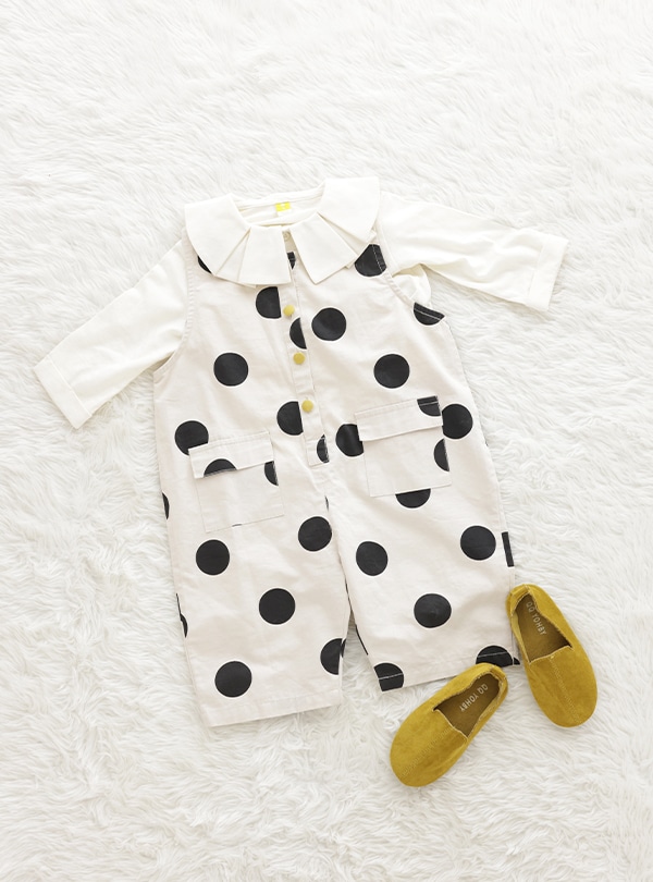 大きめのドット柄が目を引く、モノトーンのオールインワンコーデ。丸襟とフロントポケットが可愛らしさを引き立て、遊び心あふれるデザインに。差し色のマスタードイエローのシューズが全体を明るく引き締め、カジュアルながらもおしゃれなスタイリングに仕上がっています。モードな雰囲気と可愛らしさを兼ね備えた、印象的なコーディネートです。
