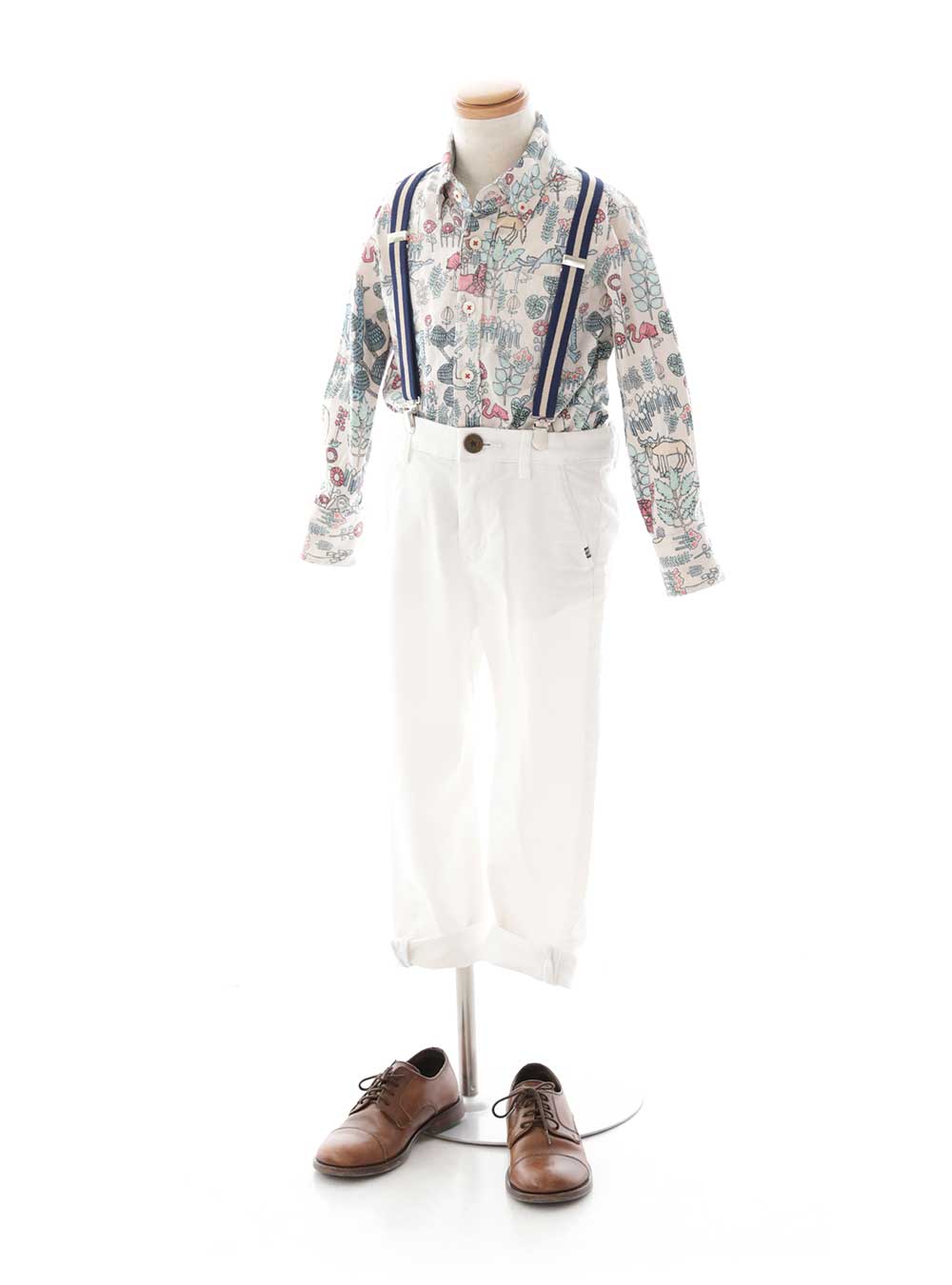 淡い色味のシャツに白パンツを合わせた洋服タイプの衣装です。シャツにはたくさんの動物や花が描かれており遊び心のあるデザインです。色味も淡く可愛らしい印象で子供らしい雰囲気が好きな方におすすめです。 ネイビーのサスペンダーもポイントになっています。ベレー帽やメガネなど小物でアレンジするのもおすすめです。