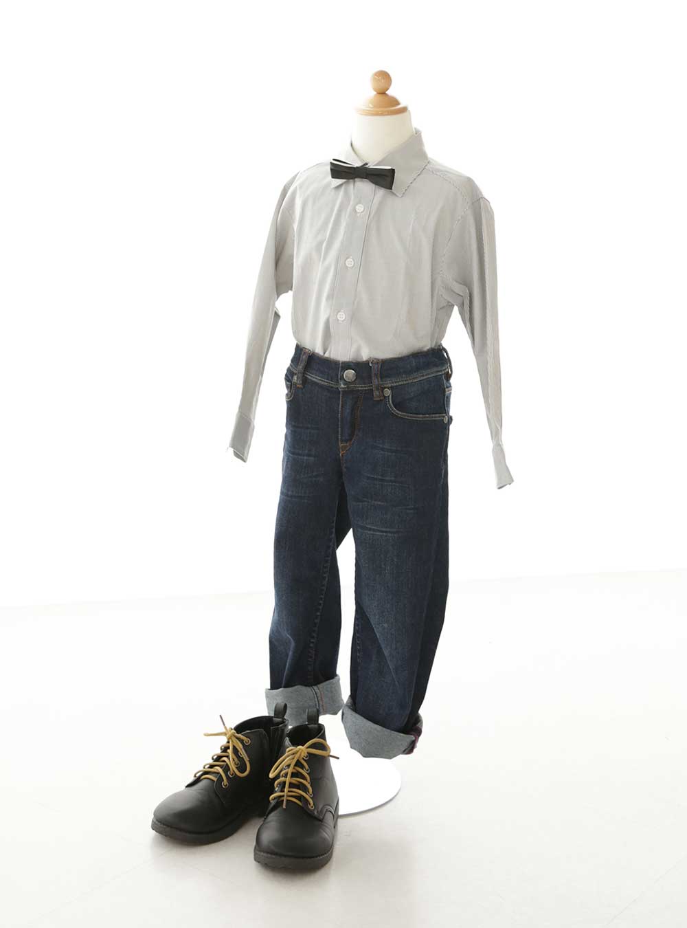 シンプルなグレーのシャツにデニムを合わせた洋服タイプの衣装です。ライトグレーのボタンダウンシャツに黒の蝶ネクタイを合わせたシンプルなコーディネート♪ ダークデニムのジーンズはロールアップされておりカジュアルな雰囲気です。ベレー帽やメガネなど小物でアレンジするのもおすすめです。