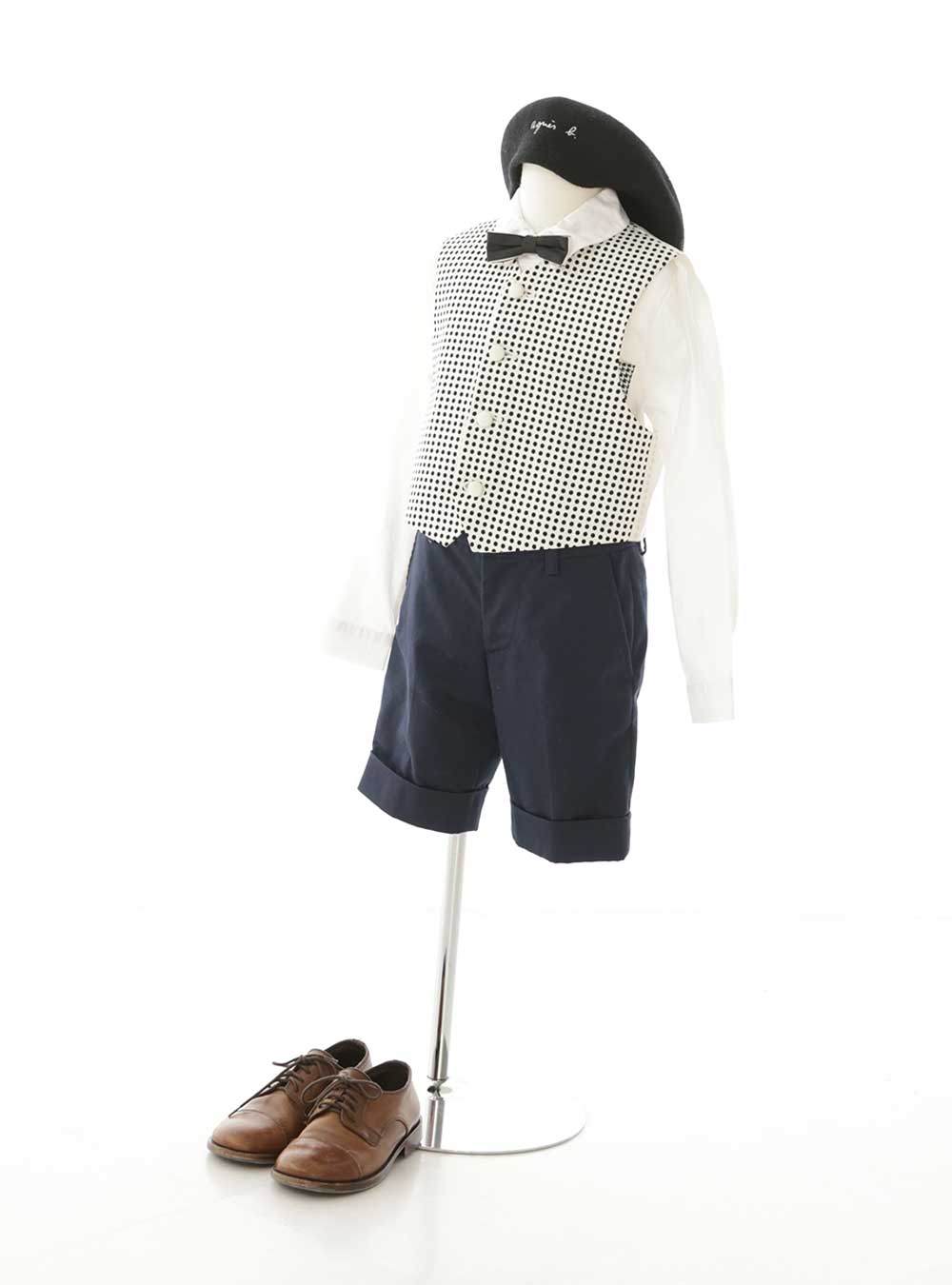 白と黒のドット柄のベストが目を引くキュートなデザインのタキシードです。全体的にモノトーンな色味で合わせたシンプルなコーディネートですので、すっきりとした印象を与えます。 ジャケットスタイルではなく、ベストとハーフパンツを組み合わせておりますのでお子様らしい可愛い雰囲気で撮影していただける一着です。