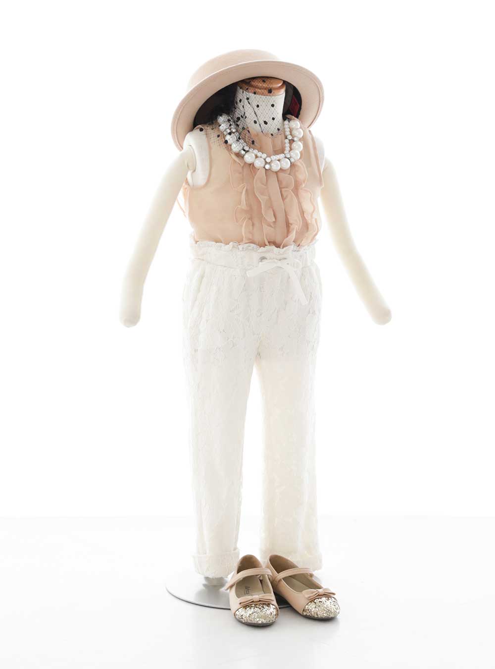 ベージュのブラウスに白のレースパンツを合わせた洋服タイプの衣装です。パンツスタイルなのでかっこよく全体的に大人っぽくスタイリッシュな雰囲気に仕上げることができます。 パンツは全体がレースになっているので上品で、ベージュカラーのブラウスとも相性抜群です。