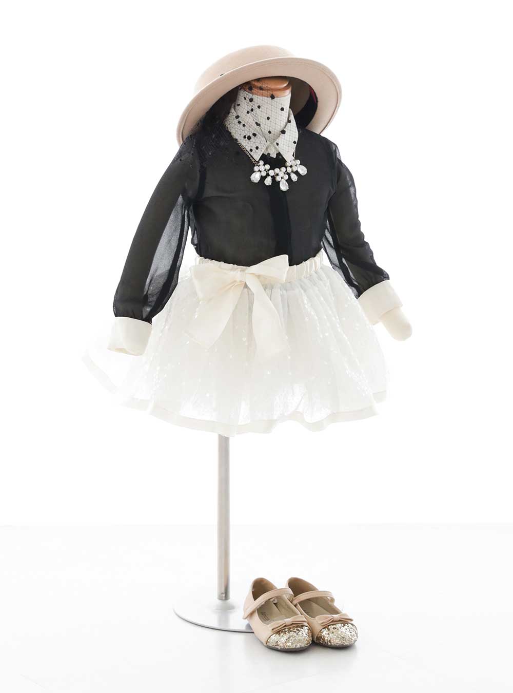 黒のシャツに白のスカートを合わせたモノトーンの洋服タイプの衣装です。シャツは白の襟が付いており、袖は透け感のある長袖になっているのでとても大人っぽい印象です。 スカ―トはラメがちりばめられた白のチュチュスカートでボリュームがあり華やかです。シルバーやパールなどのアクセサリーと相性抜群です。