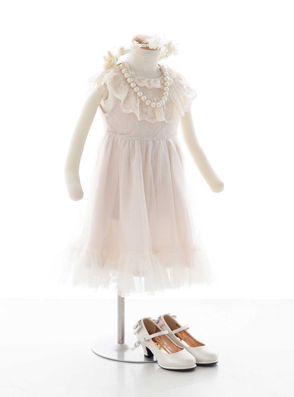 ナチュラルなピンクベージュのワンピースです。襟元のレースがフリルになっているのでとても可愛らしく女の子らしい印象です。 Aラインの上品なワンピースで、裾のチュールがフリルのようにデザインされているのもポイントです。髪飾りや足元もホワイト系でコーディネートすればよりナチュラルな雰囲気に。7歳サイズに同じ衣装があるので姉妹でお揃い撮影が可能です。