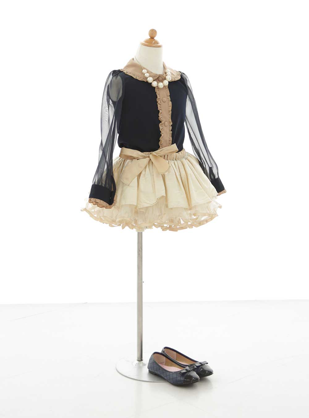 ネイビーとベージュの上品な色合わせのセレクト衣装です。袖部分はシアー感のあるデザインで軽やかな衣装です。クルミボタンと襟元や袖部分にフリルがたくさんデザインされており、おしゃれなで可愛いデザインとなっております。 クラシカルな印象で大人っぽい雰囲気が好きな方におすすめです。大きめのパールやビジューのネックレスと相性抜群♪