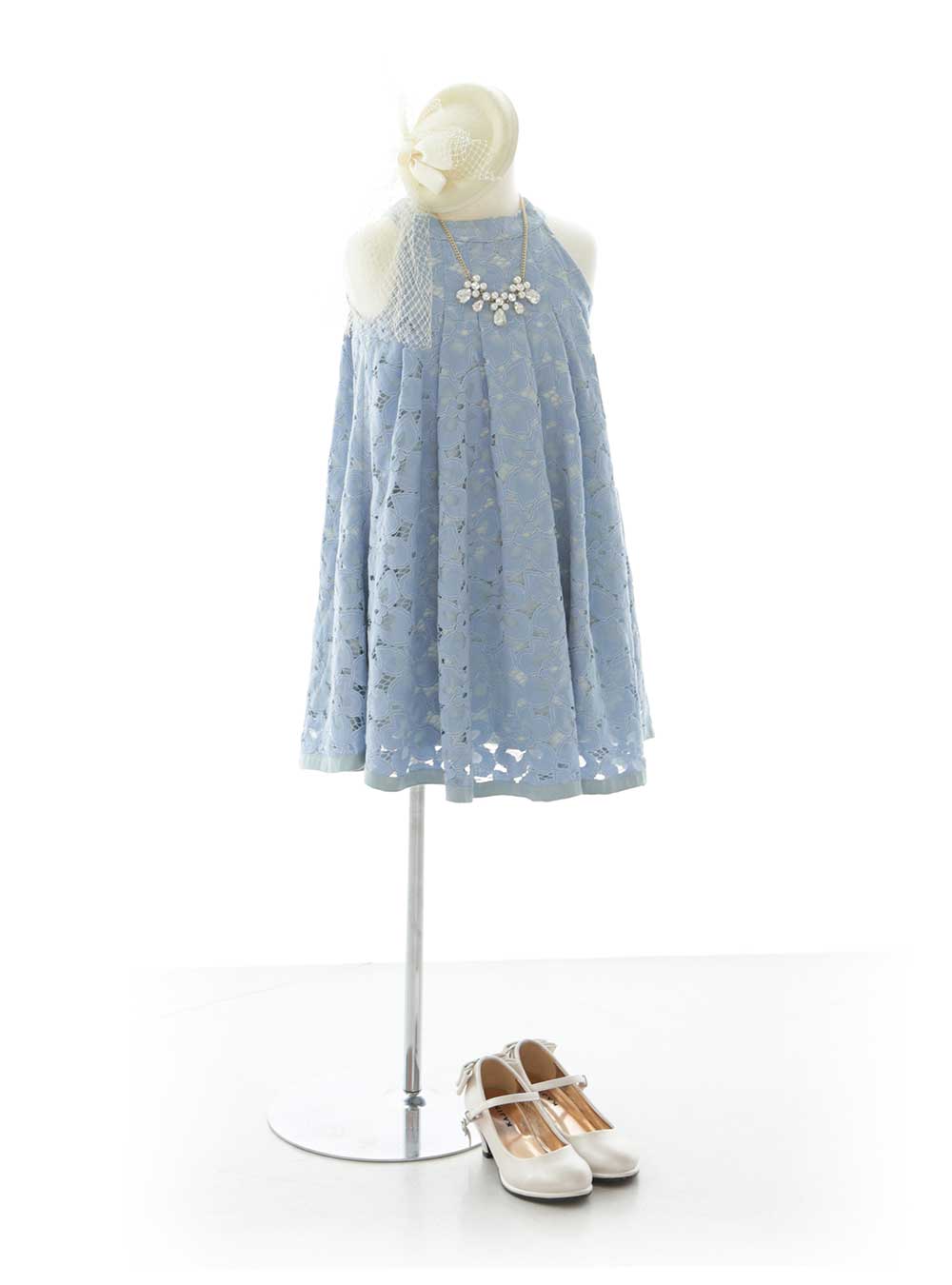 さわやかな水色のレース生地で作られたナチュラルな雰囲気のワンピースです。全体に花のデザインが施された可愛いらしいレースが印象的です。 切り替え部分のないAラインのワンピースはナチュラルで可愛らしいお子様の雰囲気を引き立てます。3歳サイズに同じ衣装があるので姉妹でお揃い撮影が可能です。