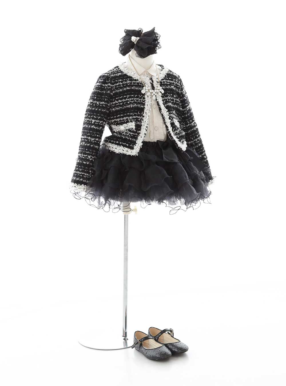トップスのブラウスの前ボタン周りはフリルとクルミボタンがポイントになっておりジャケットの間から見えるデザインが上品な印象です。ブラックのフリルチュチュはボリュームがあるデザインで、ツイードのジャケットを合わせることで上品で大人っぽい雰囲気で着ていただけます。 ツイードジャケットは入学式の撮影で人気の衣装です。