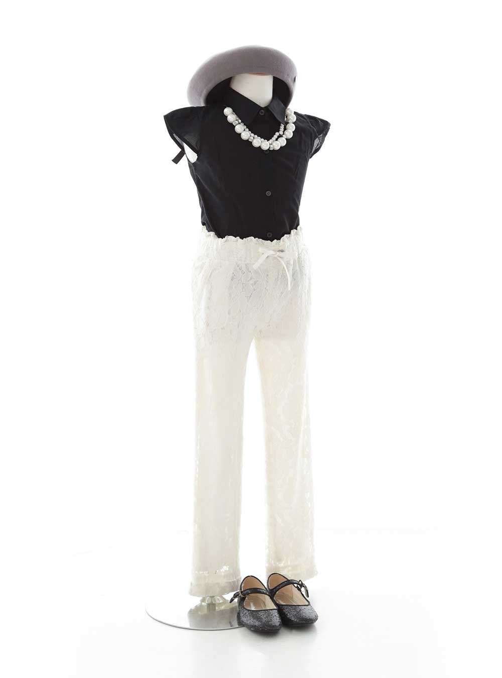 ブラックのブラウスとシンプルなホワイトパンツの組み合わせがかっこいい衣装です。トップスの袖部分がフリル袖になっておりスタイリッシュで大人っぽい印象です。 モノトーンコーディネートなのでシックでかっこいい雰囲気が好きなお子様におすすめです。ベレー帽やハットなどで差し色をいれてよりスタイリッシュな印象に。