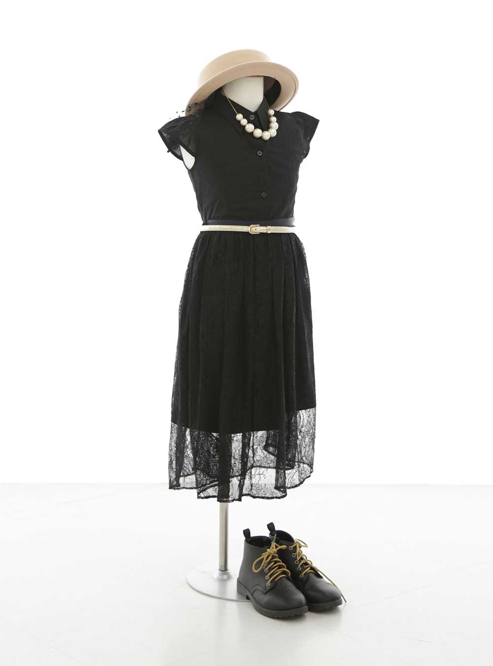 ブラックのブラウスとシンプルなチュールスカートの組み合わせがかっこいい衣装です。トップスも袖部分がフリル袖となっておりますのでスタイリッシュで大人っぽい印象です。 色味もブラックコーディネートなので、シックでかっこいい雰囲気が好き方におすすめです。合わせる帽子によって雰囲気が変わるコーディネートです。