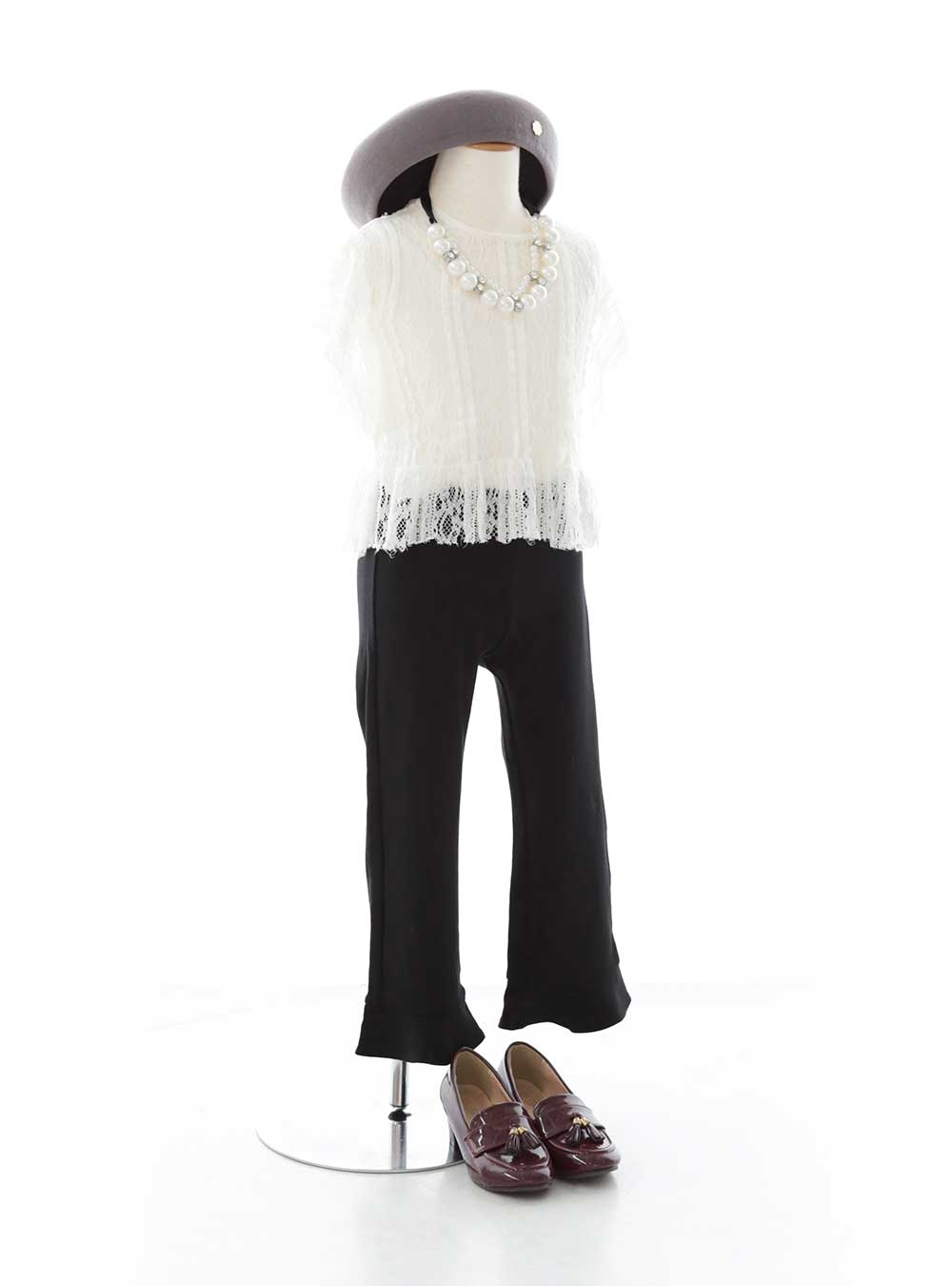 ホワイトのレーストップスとシンプルなブラックパンツの衣装です。シンプルなモノトーンコーディネートには大ぶりのパールネックレスやベレー帽を合わせることで華やかな印象になります。 トップスは総レースのデザインになっており、合わせたパンツはフレアタイプなので上品で大人っぽい雰囲気のセレクト衣装です。