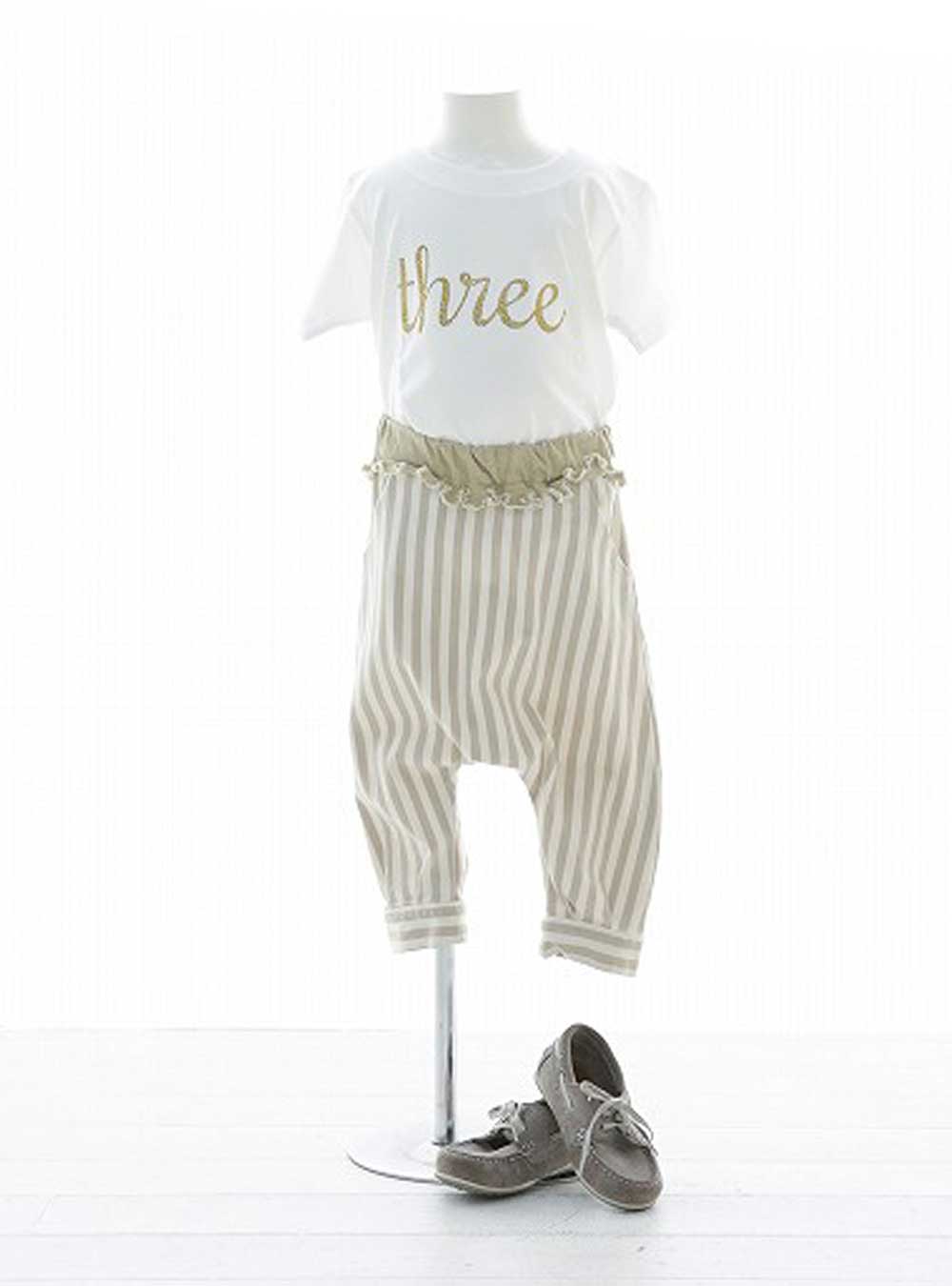 3歳のお誕生日にピッタリなthreeのTシャツ。オーバーサイズフォルムのストライプパンツがポイントで、お子様の可愛さを引き出します。 さらに全体がゆったりとしたスタイルなので、3歳さんらしい自由な動きが沢山引き出せる一着です。また、1歳用のoneのTシャツもあるので兄弟おそろいで着ていただけます。