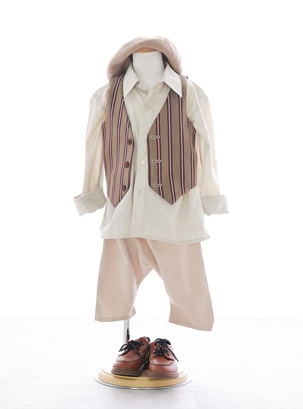 クラシカルで上品な雰囲気を演出できるセットアップスタイルです。 ベージュ系の落ち着いた色合いのシャツに、ストライプ柄のベストを合わせています。シャツはシンプルでありながらもえり付きでフォーマル感をプラス。パンツはゆったりとしたシルエットで程よい抜け感がカジュアルな印象を与えてくれます。