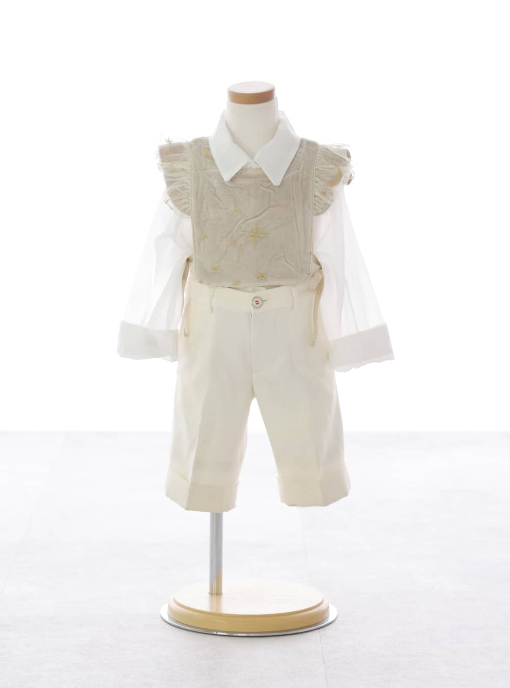 ベージュと白の優しい色合いが、お子様の愛らしさを一層引き立てます。ゴールドの星柄刺繍が散りばめられた上品なデザインとふわりと広がるフリルが華やかさを添えてくれます。 落ち着いたトーンとパンツスタイルで可愛らしすぎず、男女兼用で着ていただくことができ、統一感のある衣装です。